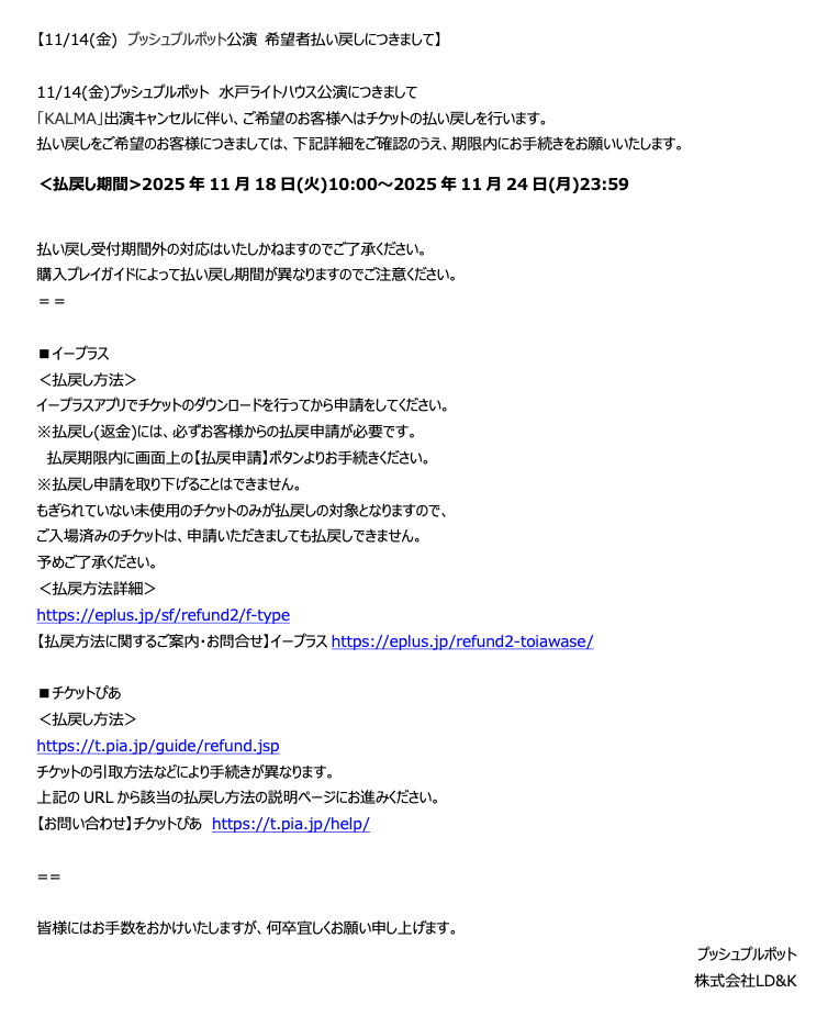 購入プレイガイドごとの払い戻し方法をご確認の上、お手続きをお願いいたします。